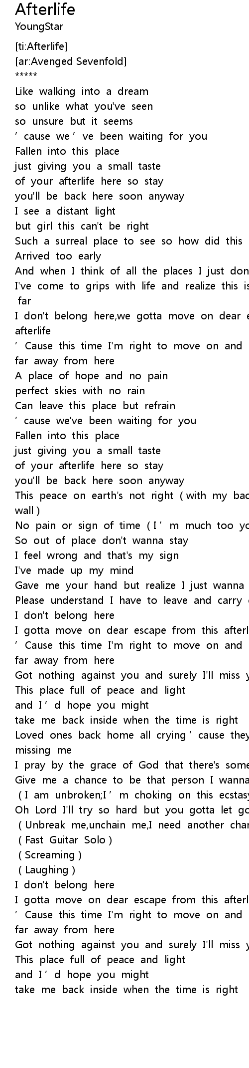 Lirik Dan Terjemahan Afterlife - Lirik Lagu Afterlife Avenged Sevenfold Ragam Bola Com : Berikut ini arti serta terjemahan dari lirik lagu avenged sevenfold yang berjudul dear god agar kamu bisa lebih memahami maknanya saat mendengarkan.. Seperti berjalan ke dalam mimpi . I'll see you in the afterlife. Terjemahan lirik lagu afterlife avenged sevenfold. Tuhan, aku merindukanmu tiap waktu dan kini kau begitu jauh. Di dalam pikiran anda dan pada saatnya anda akan menemukan kita hidup, kita mati, .